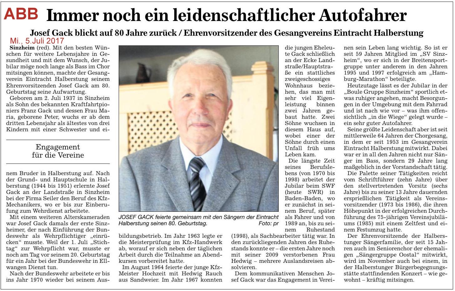80. Geburtstag unseres Ehrenvorsitzenden Josef Gack