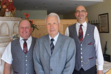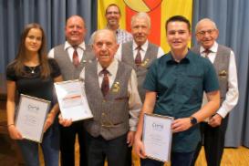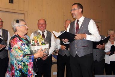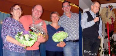Die im zurückliegenden Jahr wiederholt sehr aktiven Vereinsmitglieder - zugleich Sängerinnen u. Sänger - (v.l.) Gerda Lemay, Jürgen Gushurst u. Helga Morgenthaler-Gushurst, wurden vom Vorsitzenden Marco Frank für ihren Einsatz gelobt und geehrt. Der Sänger und Vereinskassier Eugen Ullrich (rechts)